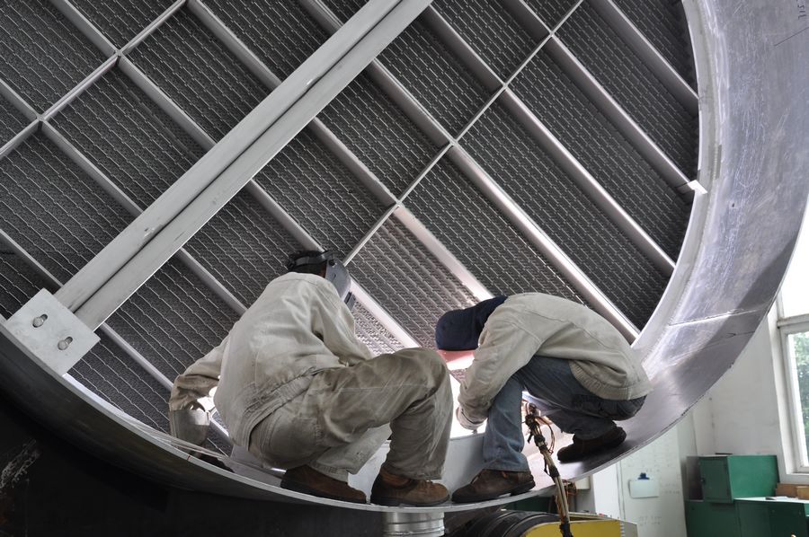 時間緊任務(wù)重,冷箱車間要求員工全力以赴,做好兩個項(xiàng)目的制造工作,確保合同交貨期。管理人員以計(jì)劃適應(yīng)變化,及時調(diào)整生產(chǎn)部署,提前查找產(chǎn)品缺件,切實(shí)做好各道工序的銜接。十月國慶期間,當(dāng)人們還沉浸在節(jié)日的歡樂中,享受假日的快樂時光時,冷箱車間員工在經(jīng)過短短的3天休息之后,又開始加班加點(diǎn)的工作。10月10日,裝載宣鋼42000空分下塔的拖車緩緩駛出車間大門,冷箱車間的努力得到了用戶的認(rèn)可和好評。寶金新城4500空分、2套內(nèi)蒙東華43000空分的制造在各班組長的帶領(lǐng)下,員工們齊心協(xié)力,奮力爭先。寶金新城4500空分下塔進(jìn)入塔板裝配階段,東華43000空分的上塔填料裝配也在緊張地進(jìn)行之中。