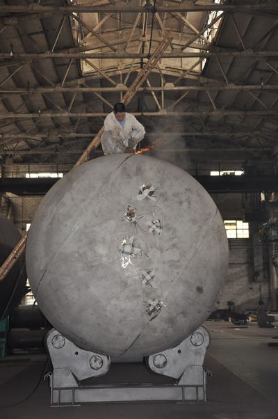 今年,容器公司的一個(gè)重點(diǎn)項(xiàng)目就是CS2120D一百二十立方米臥式液氫槽車的制作,其技術(shù)難度非常大,堪稱是一次前所未有的“遭遇戰(zhàn)”。對(duì)于這項(xiàng)艱巨的任務(wù),擅打硬仗的蔡于、朱德意作業(yè)組當(dāng)仁不讓,勇挑重?fù)?dān)。一接手,他們首先面臨的是施焊的難題。該產(chǎn)品內(nèi)筒母材含有16MN,所需焊絲特別軟,給焊接帶來(lái)相當(dāng)大的難度。面對(duì)難題,焊工師傅們迎難而上。大家集思廣益,謹(jǐn)慎施焊,每一個(gè)坡口都認(rèn)真清理,每一條焊道都仔細(xì)修磨,每一處施焊都小心翼翼,精益求精中,焊縫照光一級(jí)片合格率超過(guò)了百分之九十,為產(chǎn)品前期的順利進(jìn)行打下了一個(gè)堅(jiān)實(shí)地基礎(chǔ)。一百二十立方米臥式液氫槽車后期套裝的難點(diǎn)是安裝的銜接。冷作工師傅一邊制作的同時(shí)一邊與相關(guān)的設(shè)計(jì)工藝人員一道交流探討最佳方案。內(nèi)筒管路的走向、套管排位的選擇、支架裝配的定位等無(wú)不考驗(yàn)著人們本已緊繃的神經(jīng)。壓力下,大家并沒(méi)有沮喪與退縮,而是實(shí)實(shí)在在地邁開(kāi)了進(jìn)取的腳步。幾番上下的裝拆,幾番探索的嘗試,幾番糾結(jié)的交錯(cuò),終于,90度支架順利地安裝到位,幾十處支腳的焊接也圓滿無(wú)缺,無(wú)一漏點(diǎn),從而有效地保證了氦檢與抽真空的正常進(jìn)行。