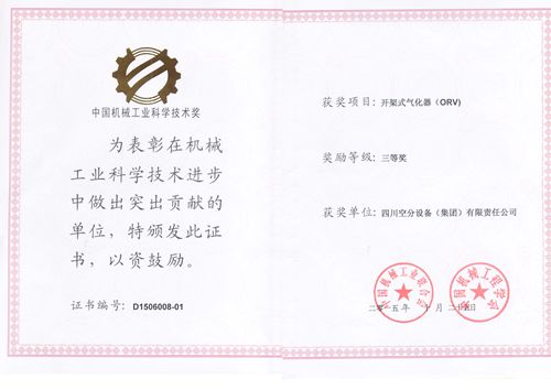 近日,我公司研發(fā)的開(kāi)架式氣化器(ORV)被中國(guó)機(jī)械工業(yè)聯(lián)合會(huì)、中國(guó)機(jī)械工程學(xué)會(huì)授予中國(guó)機(jī)械工業(yè)科學(xué)技術(shù)獎(jiǎng)三等獎(jiǎng)。