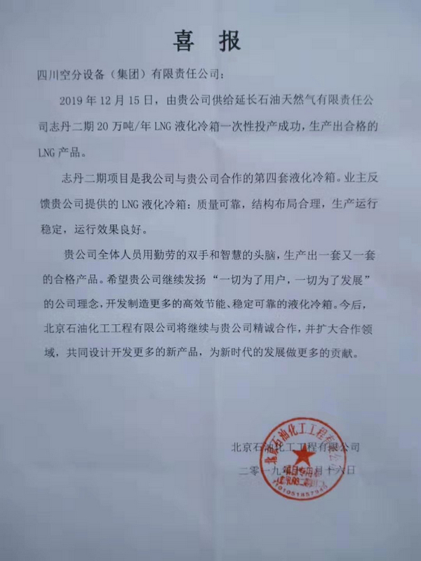 該項(xiàng)目的成功,對(duì)于填補(bǔ)天然氣市場(chǎng)缺口、發(fā)展清潔能源、輻射帶動(dòng)當(dāng)?shù)氐胤浇?jīng)濟(jì)具有十分重要的意義。標(biāo)志著用戶方成功躋身國(guó)內(nèi)最大的LNG生產(chǎn)經(jīng)營(yíng)公司行列,也進(jìn)一步夯實(shí)了我公司作為中國(guó)最大LNG冷箱制造企業(yè)的行業(yè)地位。為此,北京石油化工工程有限公司特向我公司發(fā)來喜報(bào)。