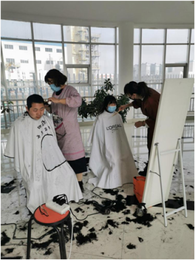 2月20日,公司通知員工到指定地點(diǎn)剪發(fā),提前對(duì)剪發(fā)區(qū)域和剪發(fā)用具進(jìn)行酒精消毒,對(duì)剪發(fā)的員工做好體溫測(cè)量工作。兩個(gè)板凳、一面鏡子,我們的剪發(fā)工作開(kāi)始了。