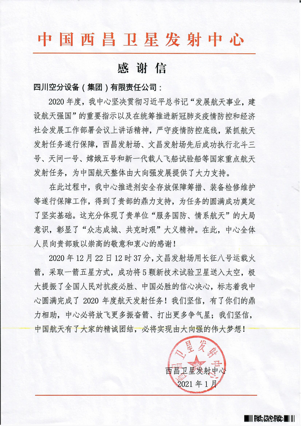 近日,西昌衛(wèi)星發(fā)射中心給我公司發(fā)來感謝信,對我公司在西昌發(fā)射場、文昌發(fā)射場先后成功執(zhí)行北斗三號、天問一號、嫦娥五號和新一代載人飛船試驗(yàn)船等國家重點(diǎn)航天發(fā)射任務(wù)過程中,為西昌衛(wèi)星發(fā)射中心推進(jìn)劑安全存放保障籌措、裝備檢修維護(hù)等遂行保障工作提供的大力支持致以崇高的敬意和衷心的感謝。