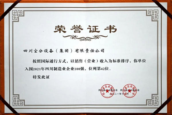 按照國際通行方式,以銷售(營業(yè))收入為標準排序,我公司入圍四川省制造業(yè)企業(yè)100強,位列第42位,并被四川省企業(yè)聯(lián)合會、四川省企業(yè)家協(xié)會頒發(fā)榮譽證書。