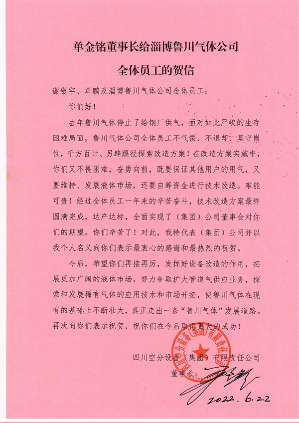 去年魯川氣體停止了給鋼廠供氣,面對(duì)如此嚴(yán)峻的生存困難局面,魯川氣體公司全體員工不氣餒、不退卻、堅(jiān)守崗位,千方百計(jì)、另辟蹊徑探索改造方案!在改造方案實(shí)施中,你們又不畏困難,奮勇向前,既要保證其他用戶的用氣,又要維持、發(fā)展液體市場,還要自籌資金進(jìn)行技術(shù)改造。難能可貴!經(jīng)過全體員工一年來的辛苦奮斗,技術(shù)改造方案最終圓滿完成,達(dá)產(chǎn)達(dá)標(biāo),全面實(shí)現(xiàn)了(集團(tuán))公司董事會(huì)對(duì)你們的期望。你們辛苦了!對(duì)此,我特代表(集團(tuán))公司并以我個(gè)人名義向你們表示最衷心的感謝和最熱烈的祝賀。