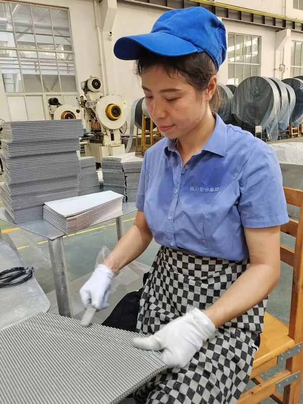 冷箱廠在完成應城50000空分上塔裝配填料的過程中,員工們不怕酷熱,揮汗如雨,8月12日,上塔最后一段塔器完工發(fā)運。8月15日,經(jīng)過員工們的辛勤工作,容器廠完成了邯鄲精制F314.60000的撬裝裝配任務。當天晚上9點鐘,容器二車間燈火通明,該項目所有設備發(fā)運出廠。8月16日,貴州中偉8000空分上塔、液氧蒸發(fā)器、下塔與主冷復合,全部完工等待發(fā)運。8月19日前,換熱器廠完成了恒重、延長項目等多個的主換熱器制造任務。