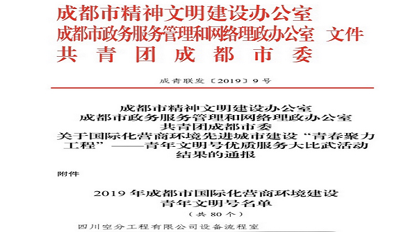 四川空分集團工程有限公司設備流程室榮獲“2019年成都市國際化營商環(huán)境建設” 青年文明號稱號
